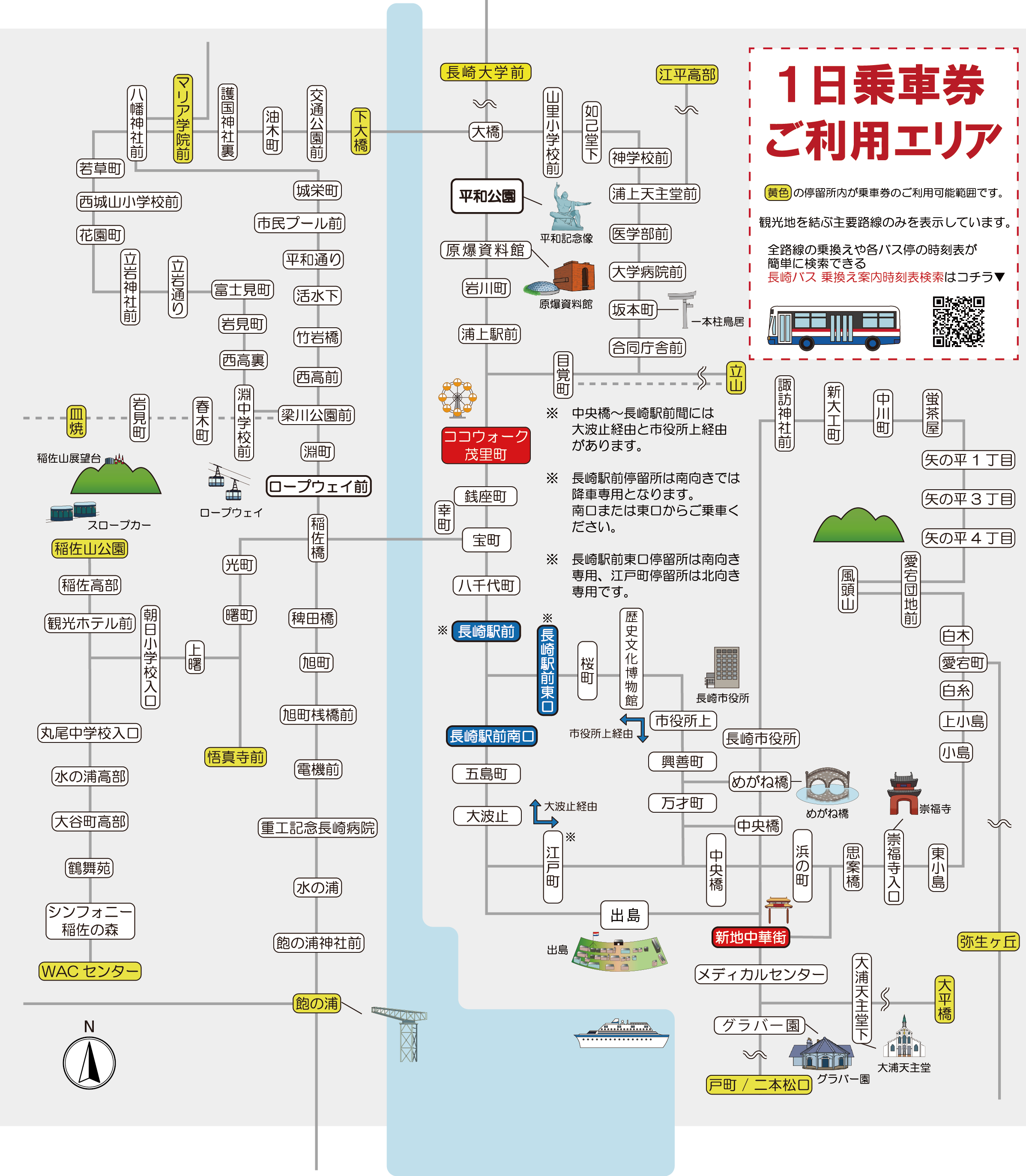 - 長崎市内指定利用区間内であれば、バスが1日何度でも乗り降りできます。