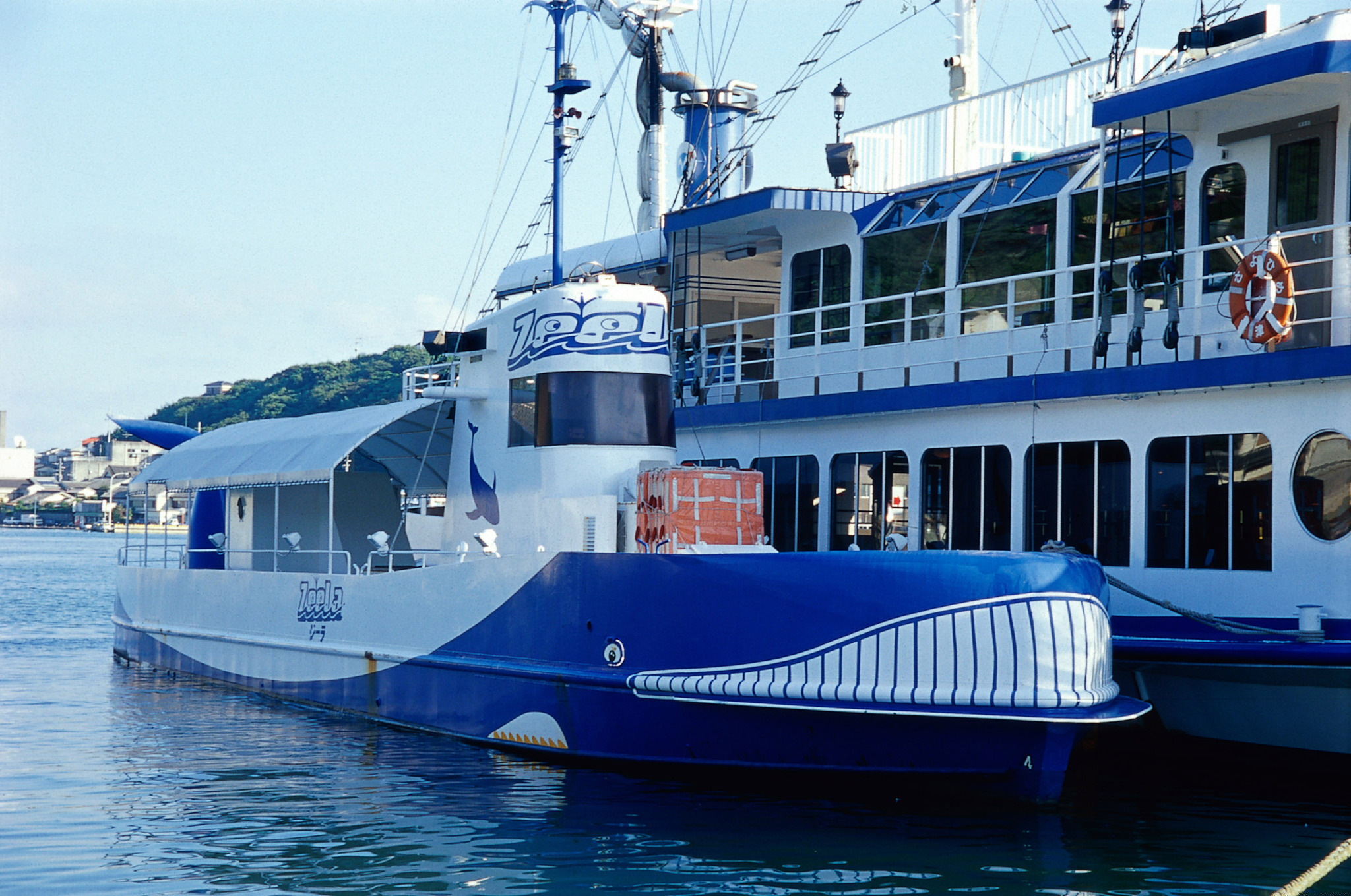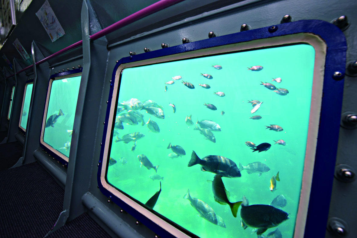ジーラは、北部九州では初めての半潜水型海中展望船。船内は左右に大きな窓を見開いた展望室になっていて、海面下1.2mにいる魚や海の生物の姿を鑑賞できます。