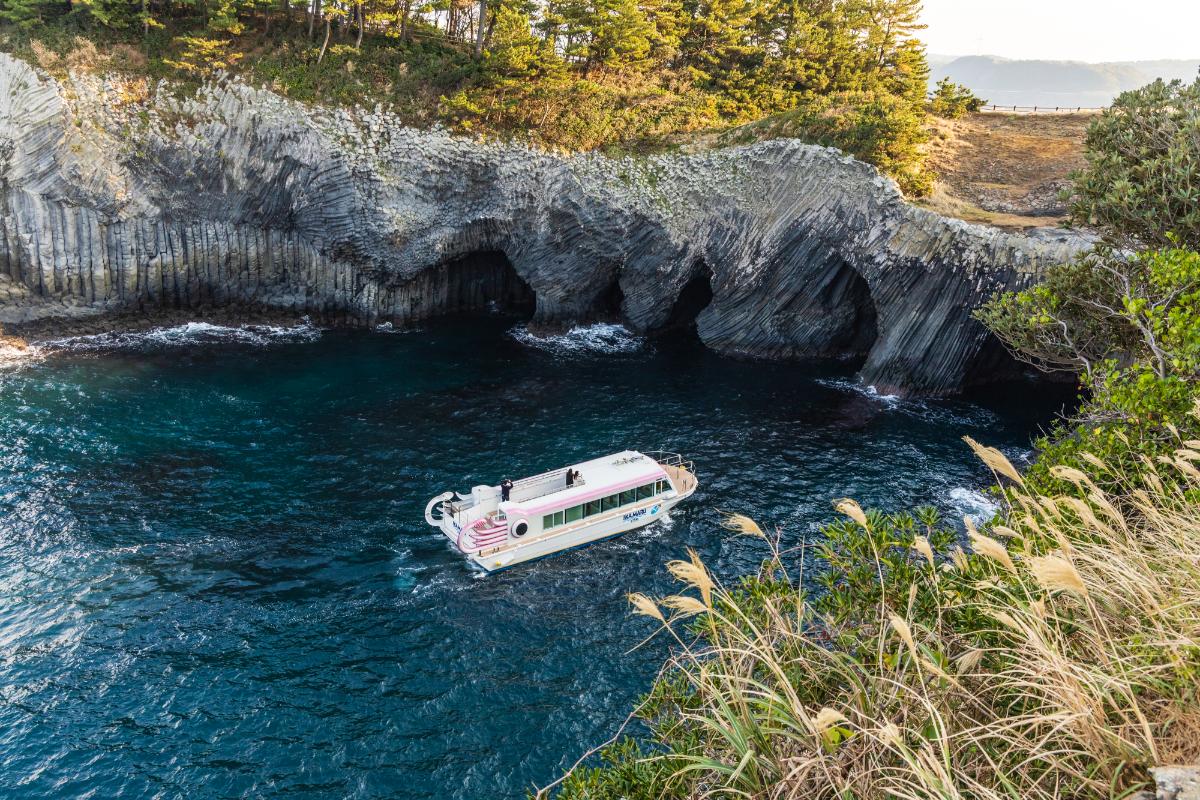 イカ丸は、海上からの七ツ釜鑑賞と呼子クルージングをお楽しみいただけます。
